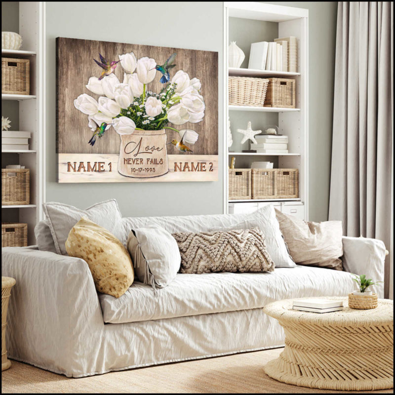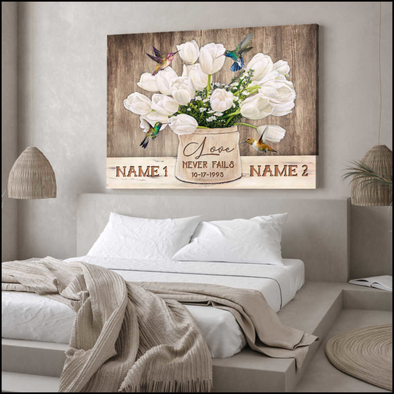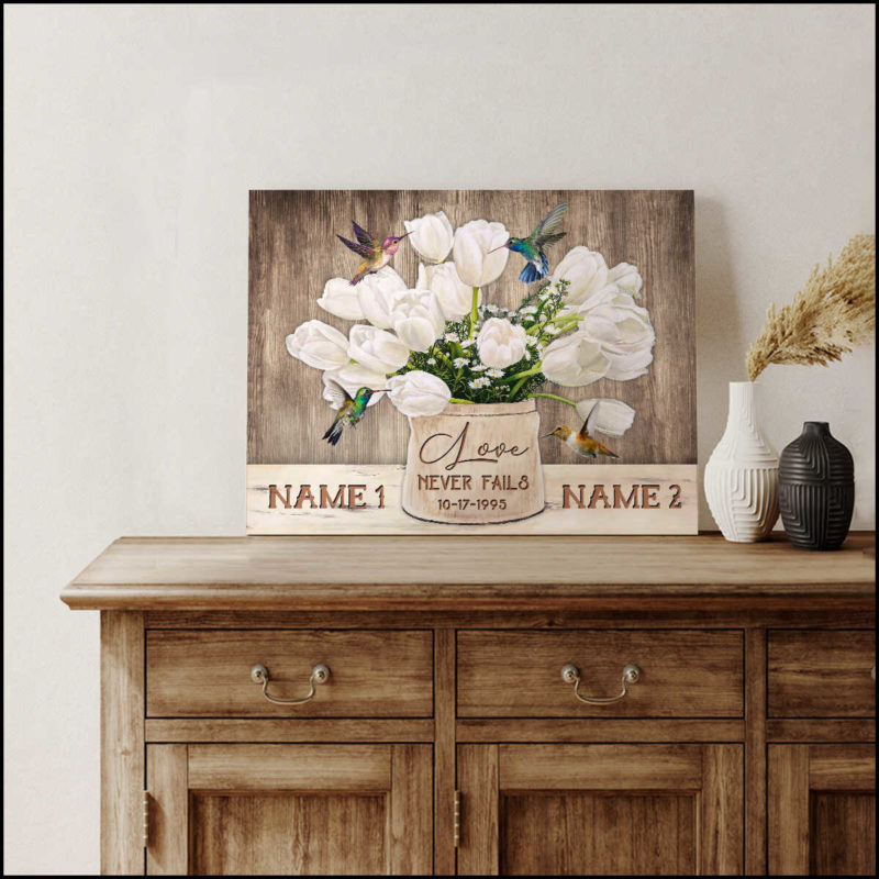 Personalized Canvas Wall Art Home Decor Wedding Anniversary Love never fails Tulip Flowers and Hummingbirds CA219