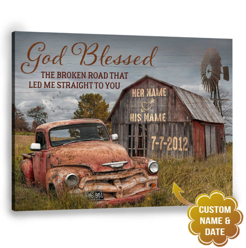 Personalized Canvas Wall Art Home Decor Anniversary Wedding Gift God Blessed The Broken Road Old Truck and Barn CA214