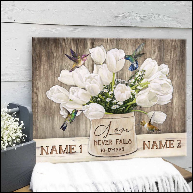 Personalized Canvas Wall Art Home Decor Wedding Anniversary Love never fails Tulip Flowers and Hummingbirds CA219